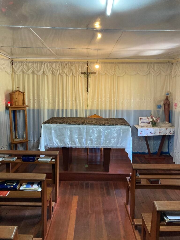 Quatre heures de routes nationales en piteux état, quatre heures de piste en terre sans entretien, deux heures d’attente dans les gares routières, telles sont les conditions pour rendre visite à la Communauté des Sœurs Missionnaires et Adoratrices de la Sainte Famille. Ici, dans cette campagne éloignée de tout, il faut souvent marcher des heures pour atteindre certains villages, m’informe le Père Chrysostome, Curé de 26 Paroisses dans ce secteur avec un autre Confrère. Les Sœurs ont mis en place un petit internat pour les jeunes élèves les plus éloignés (plus de deux heures de marche) de l’école de la Communauté. Un projet d’extension de l’internat est en cours ; notre association désire y participer, dans la mesure de ces moyens financiers. Actuellement, le dispensaire tourne au ralenti, les gens sont pauvres, ils ne viennent consulter qu’en cas de maladies graves. Les parents payent, en partie, l’écolage de leurs enfants avec la fourniture de riz. Sœur Marie Odette, responsable de la Communauté, remercie notre association pour l’offre de dix bancs destinés à la chapelle de la Communauté ainsi que du matériel religieux. Jusqu’ici on priait les genoux au sol, ce qui était bien inconfortable pour les Sœurs âgées particulièrement. La Chapelle est un lieu de recueillement quotidien, les religieuses y passent en moyenne trois heures/jour.