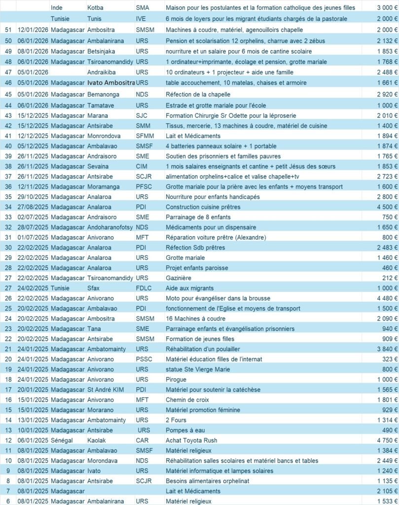 Projets Tous les financements font l’objet d’un discernement et d’une visite de la mission afin d’assurer l’objet de l’association qui est de soutenir les œuvres en vue du soin des corps et du salut des âmes.